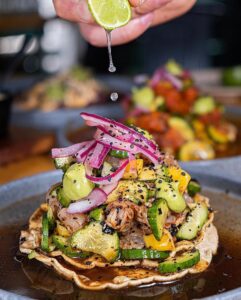 Shrimp cooked inlemon and lime juice, mango, cilantro, slices of cucumber and slices of onion.